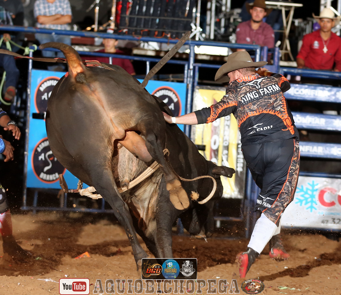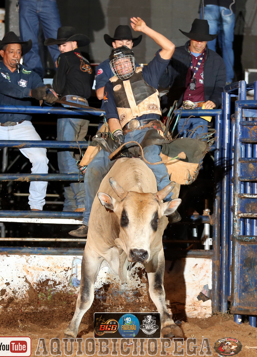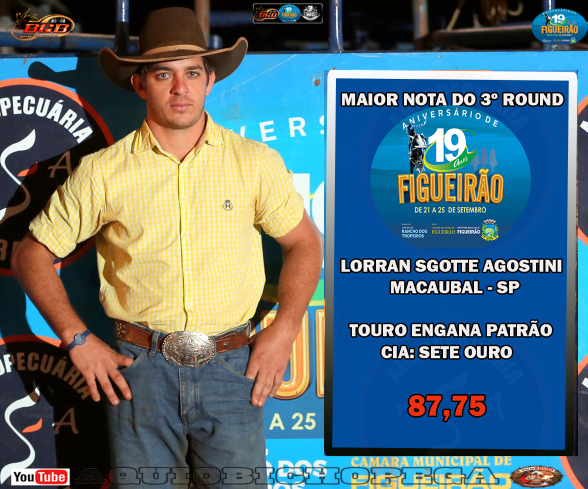Terceiro round da disputa rodeio em touros do FIGUEIRÃO rodeio fest! onde a competição que começou com 43 competidores vai se afunilando e agora apenas 13 competidores ficaram para a disputa semifinal e final, uma noite cheia de emoções com competidor de Macaubal -SP, LORRAN SGOTTE garante sua vaga fazendo a maior nota na noite montando o touro engana patrão da Cia sete ouro com a nota 87.75.